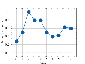 >>> from torch import rand, randint >>> # Example plotting multiple values >>> from torchmetrics.classification import BinarySpecificity >>> metric = BinarySpecificity() >>> values = [ ] >>> for _ in range(10): ... values.append(metric(rand(10), randint(2,(10,)))) >>> fig_, ax_ = metric.plot(values)