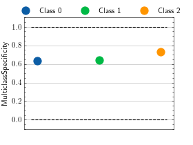 \[\text{Specificity} = \frac{\text{TN}}{\text{TN} + \text{FP}}\]Where \(\text{TN}\) and \(\text{FP}\) represent the number of true negatives and false positives respectively. The metric is only proper defined when \(\text{TN} + \text{FP} \neq 0\). If this case is encountered for any class, the metric for that class will be set to 0 and the overall metric may therefore be affected in turn.
