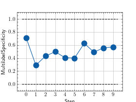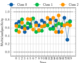 >>> from torch import rand, randint >>> # Example plotting multiple values >>> from torchmetrics.classification import MultilabelSpecificity >>> metric = MultilabelSpecificity(num_labels=3) >>> values = [ ] >>> for _ in range(10): ... values.append(metric(randint(2, (20, 3)), randint(2, (20, 3)))) >>> fig_, ax_ = metric.plot(values)