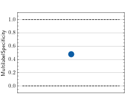 >>> from torch import tensor >>> from torchmetrics.classification import MultilabelSpecificity >>> target = tensor([[0, 1, 0], [1, 0, 1]]) >>> preds = tensor([[0, 0, 1], [1, 0, 1]]) >>> metric = MultilabelSpecificity(num_labels=3) >>> metric(preds, target) tensor(0.6667) >>> mls = MultilabelSpecificity(num_labels=3, average=None) >>> mls(preds, target) tensor([1., 1., 0.])
