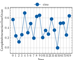 >>> # Example plotting multiple values >>> import torch >>> from torchmetrics.detection import CompleteIntersectionOverUnion >>> preds = [ ... { ... "boxes": torch.tensor([[296.55, 93.96, 314.97, 152.79], [298.55, 98.96, 314.97, 151.79]]), ... "scores": torch.tensor([0.236, 0.56]), ... "labels": torch.tensor([4, 5]), ... } ... ] >>> target = lambda : [ ... { ... "boxes": torch.tensor([[300.00, 100.00, 315.00, 150.00]]) + torch.randint(-10, 10, (1, 4)), ... "labels": torch.tensor([5]), ... } ... ] >>> metric = CompleteIntersectionOverUnion() >>> vals = [] >>> for _ in range(20): ... vals.append(metric(preds, target())) >>> fig_, ax_ = metric.plot(vals)